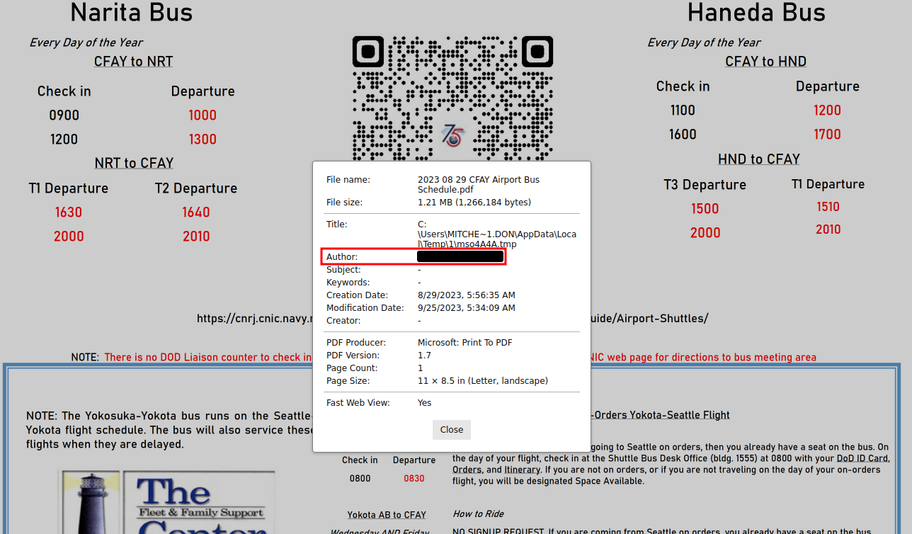 The US Navy Commander Fleet Activities Yokosuka (CFAY) operates a shuttle bus service between Haneda airport/Narita airport and the base for US military personnel. Answer the name of the person who created the document about the boarding location of the bus in 2023.
