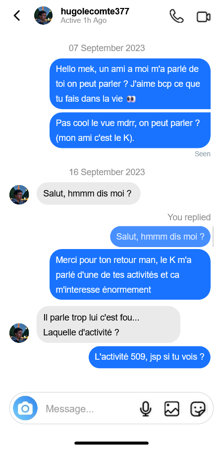 Found the screenshot with the earlies conversation date with hugolecomte377: