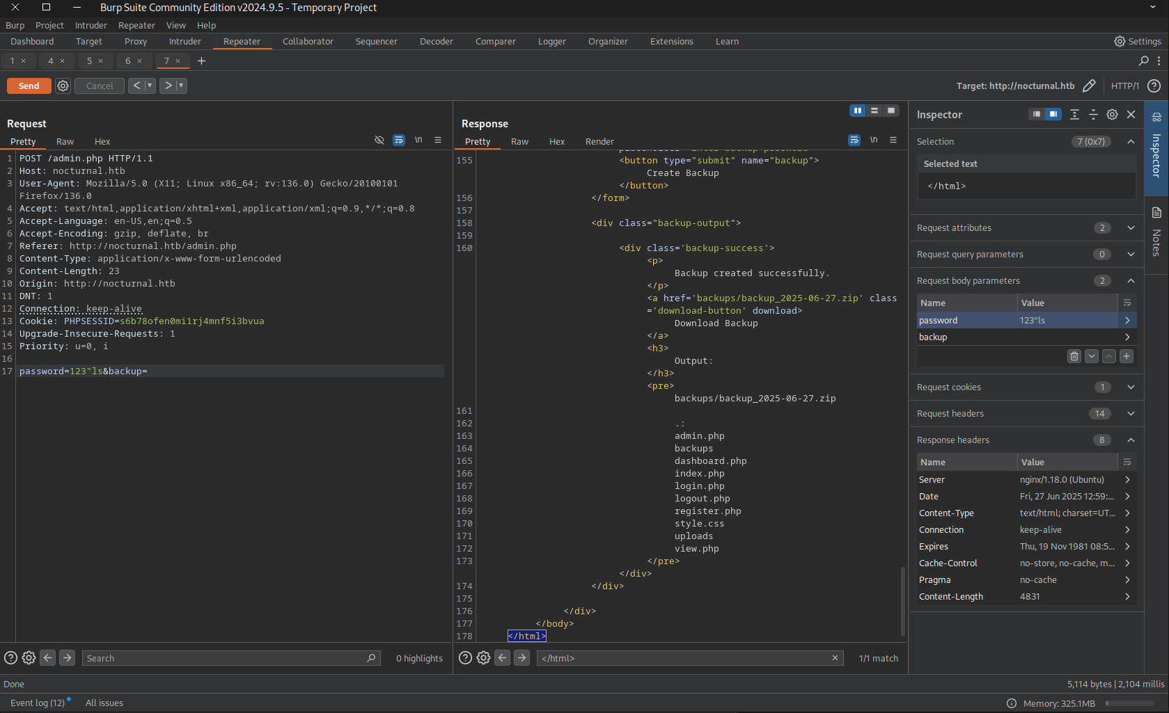 The highlighted line above lists all restricted characters, which includes a number of common characters used for chaining shell commands. Nevertheless, " is not a restricted character, which means it can be used to end the password input early and inject an OS command like ls: