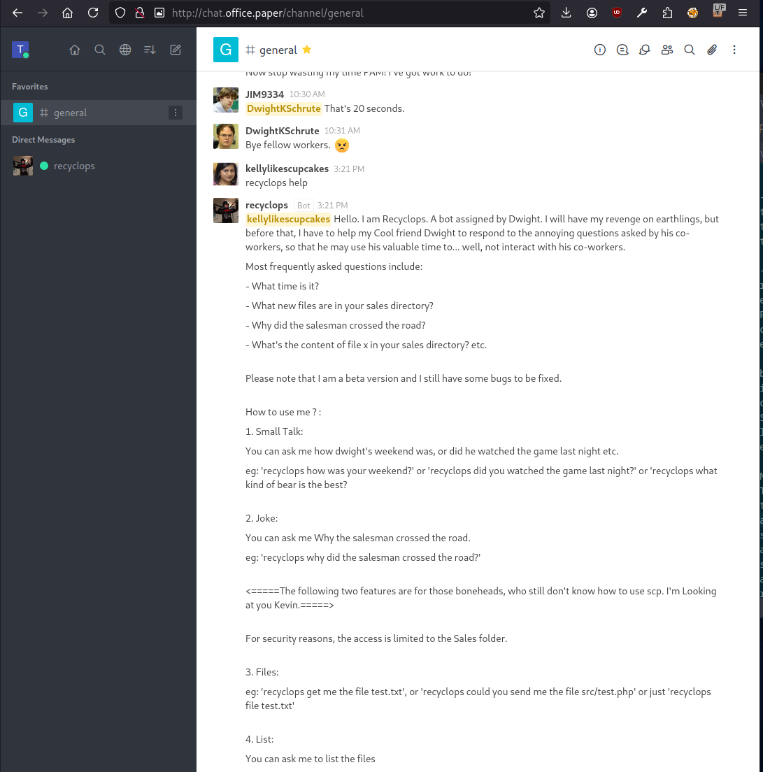 Registered an account and accessed the company chat server. There is a single channel available, #general. According to the exisiting conversation, there is a bot available that can be used to read local files: